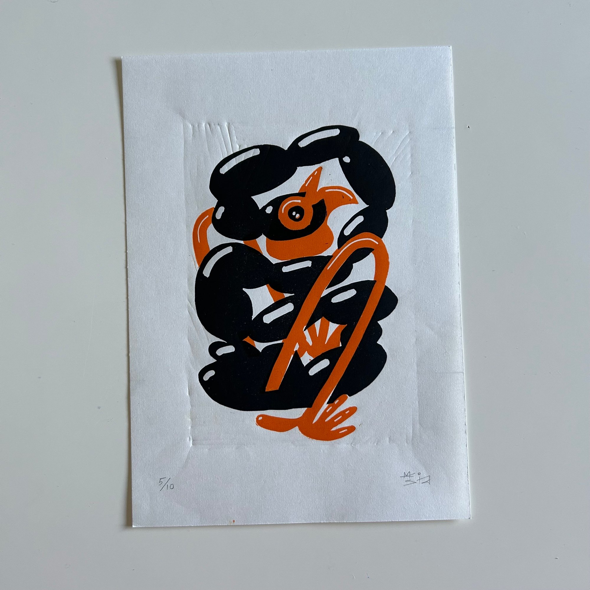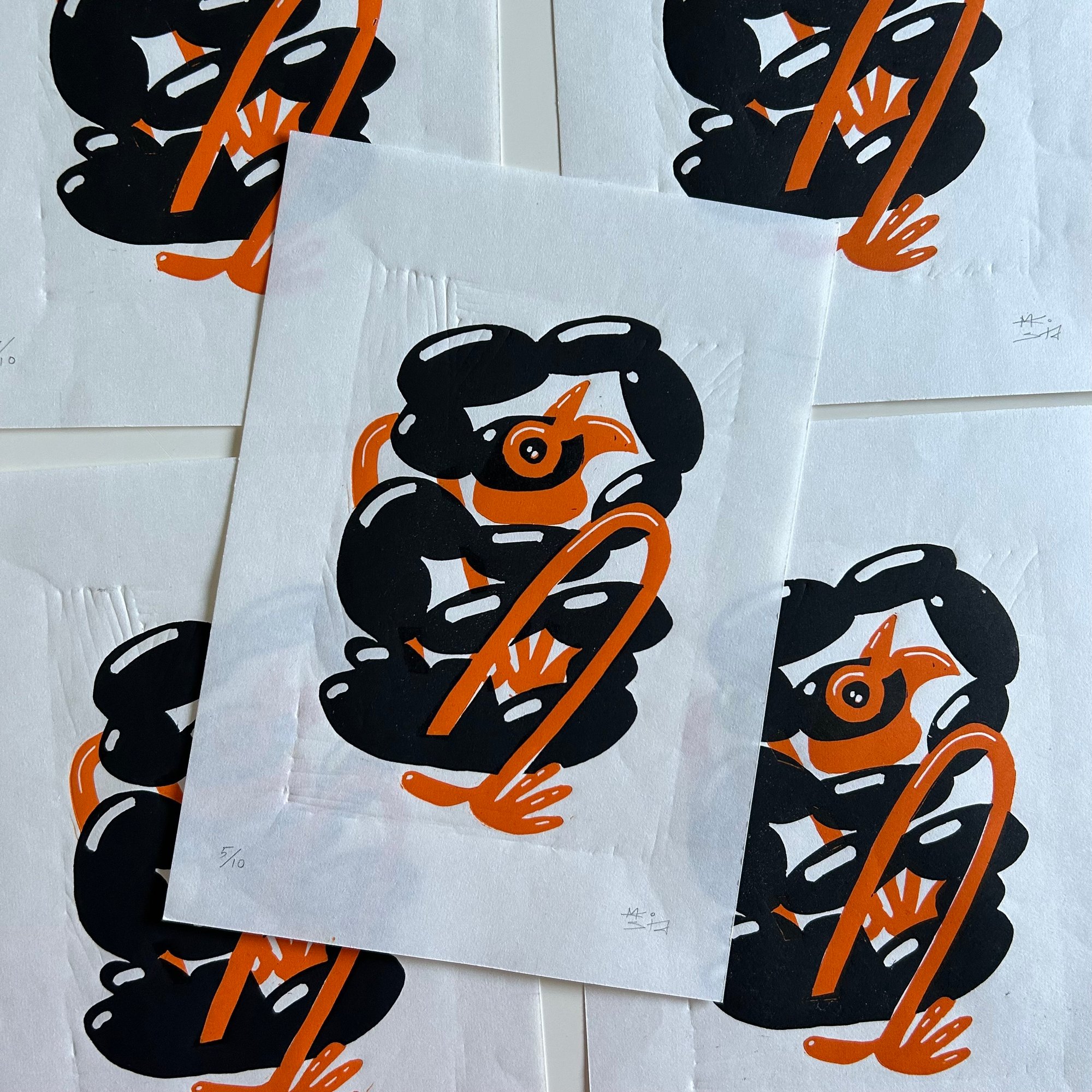 I will be donating $30 from editions of this lino relief print (Rebound) purchased by December 14th 2025, with the sales shared between two community organisations.